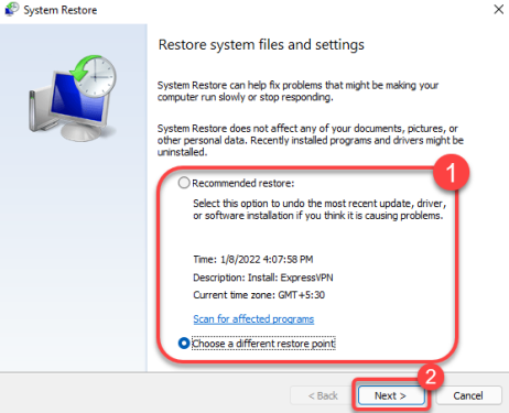 Выберите рекомендуемую точку восстановления или выберите другую точку восстановления, если вы хотите выбрать другую точку восстановления, и нажмите кнопку Далее. Обратите внимание, что все приложения, которые вы установили после даты создания точки восстановления, будут удалены.