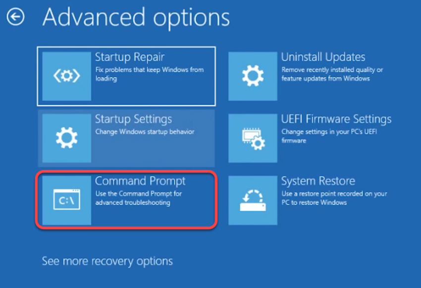 - Перейдите к разделу «Устранение неполадок»> «Дополнительные параметры»> «Командная строка».