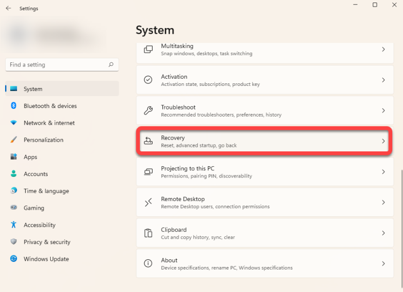 - Закройте все открытые окна, нажмите Win+I и перейдите в «Система» > «Восстановление».