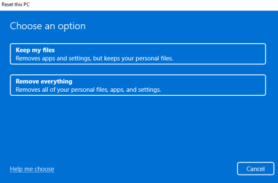 - Выберите параметр «Сохранить мои файлы», если вы хотите сохранить какие-либо личные данные или файлы нетронутыми. В качестве альтернативы выберите «Удалить все», если вы хотите стереть все данные на жестком диске. Обратите внимание, что в обоих случаях вы потеряете все установленные приложения и настройки, поэтому вам нужно будет переустановить их после сброса.