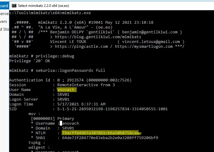 В выводе будут перечислены активные пользовательские сессии, включая их NTLM-хэши. Например: