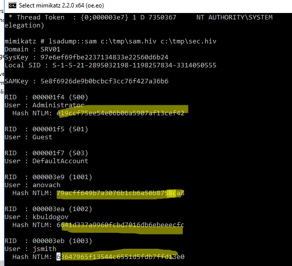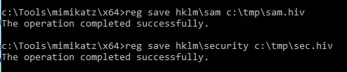 lsadump::sam C:tmpsam.hiv C:tmpsec.hiv