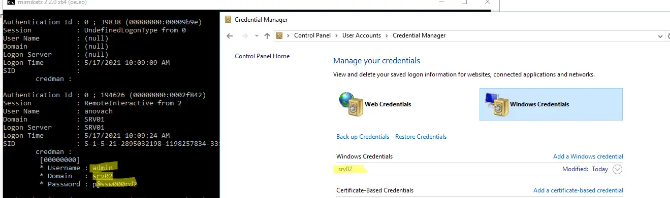 Mimikatz позволяет извлечь пароли, сохраненные в Диспетчере учетных данных Windows (например, для RDP или веб-сайтов):