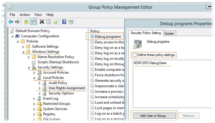 5. Запретите отладку процессов (SeDebugPrivilege) через GPO: Конфигурация компьютера -> Политики -> Параметры Windows -> Параметры безопасности -> Назначение прав пользователя -> Отладка программ.