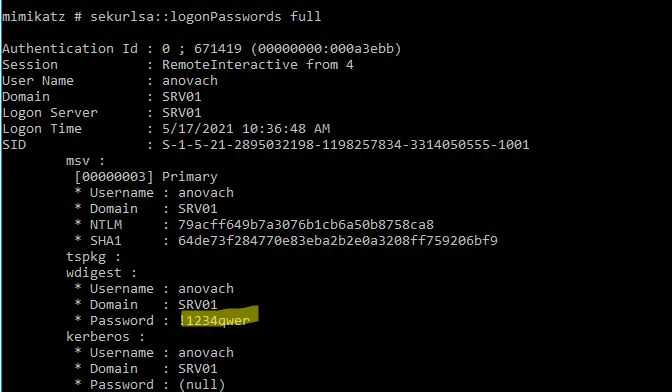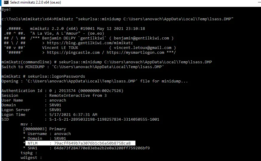 sekurlsa::minidump C:UsersanovachAppDataLocalTemplsass.DMP