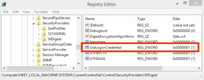reg add HKLMSYSTEMCurrentControlSetControlSecurityProvidersWDigest /v UseLogonCredential /t REG_DWORD /d 1