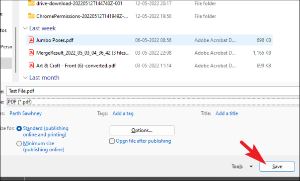 После этого нажмите кнопку «Сохранить» в правом нижнем углу окна, чтобы сохранить файл в формате PDF. Вот и все, вы успешно изменили тип файла документа с помощью Microsoft Word.