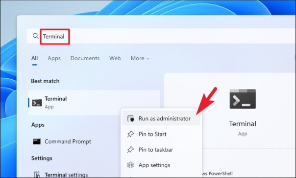 После этого перейдите в меню «Пуск» и введите «Терминал», чтобы выполнить его поиск. В результатах поиска щелкните правой кнопкой мыши плитку «Терминал» и выберите в списке параметр «Запуск от имени администратора», чтобы продолжить.