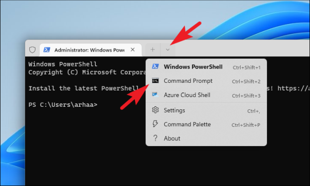 После этого в окне «Терминал» щелкните значок шеврона (стрелка вниз), присутствующий на верхней панели, и щелкните, чтобы выбрать параметр «Командная строка» из списка, чтобы продолжить. Это откроет командную строку на отдельной вкладке.