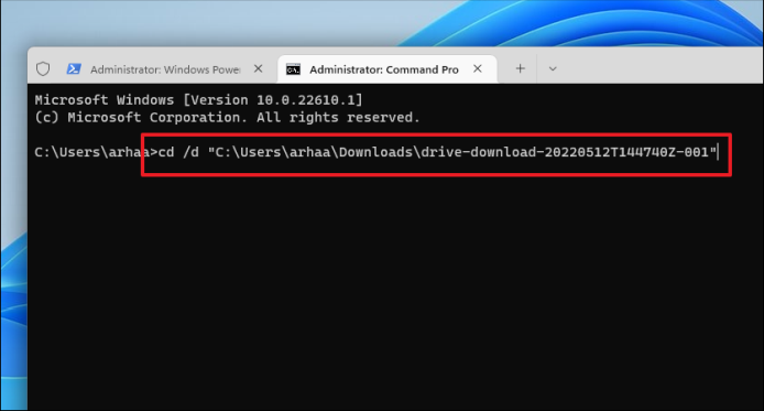 В окне командной строки сначала введите или скопируйте+вставьте указанную ниже команду, чтобы установить каталог. Кроме того, вставьте сюда путь к каталогу, который вы скопировали ранее из Проводника, в кавычках.