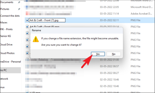 Теперь, переименовывая файл, убедитесь, что вы направляетесь к части расширения имени файла, то есть к части после точки. Затем измените расширение на то, которое относится к той же категории, чтобы не повредить файл и по-прежнему иметь возможность его просматривать. После этого нажмите Enter на клавиатуре, чтобы сохранить изменения. Это вызовет предупреждение на ваш экран.