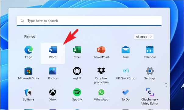 Сначала перейдите в меню «Пуск» и введите Word, чтобы выполнить его поиск. Затем в результатах поиска щелкните плитку «Word», чтобы открыть ее.