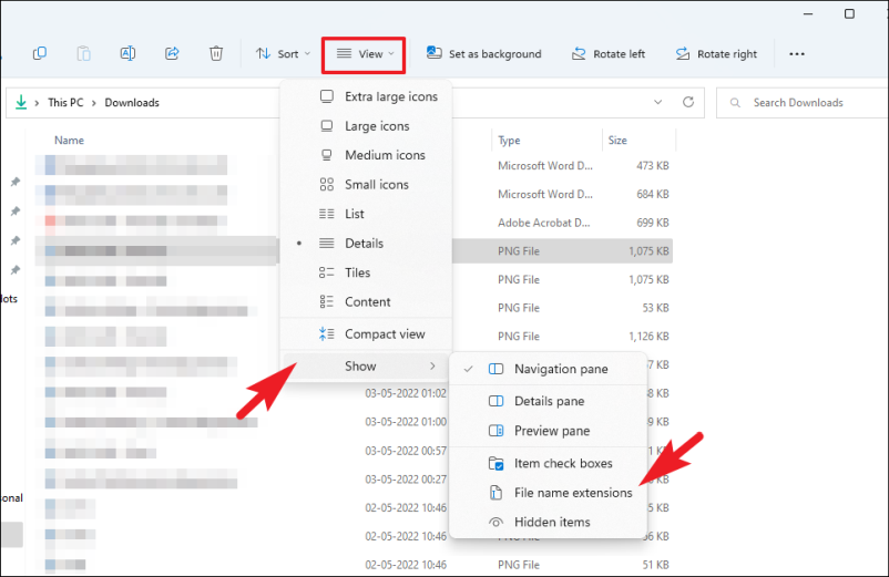 Примечание. Убедитесь, что вы включили параметр «Показать расширения файлов» на панели инструментов, так как без этого вы будете просто переименовывать файл, а не фактическое расширение.