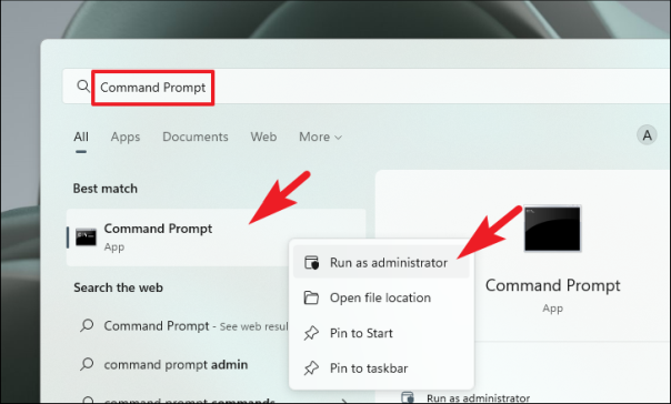 Для этого сначала перейдите в меню «Пуск» и введите Command Promptпоиск. Затем в результатах поиска щелкните правой кнопкой мыши плитку «Командная строка», чтобы открыть контекстное меню, а затем щелкните, чтобы выбрать параметр «Запуск от имени администратора», чтобы открыть его.