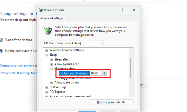 После того, как подраздел гибернации будет расширен, щелкните текстовое поле после параметра «Батарея», затем введите «Никогда» в текстовое поле, чтобы продолжить.