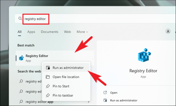 Сначала перейдите в меню «Пуск» и введите «Редактор реестра», чтобы выполнить поиск. Затем в результатах поиска щелкните плитку редактора реестра, чтобы открыть ее.