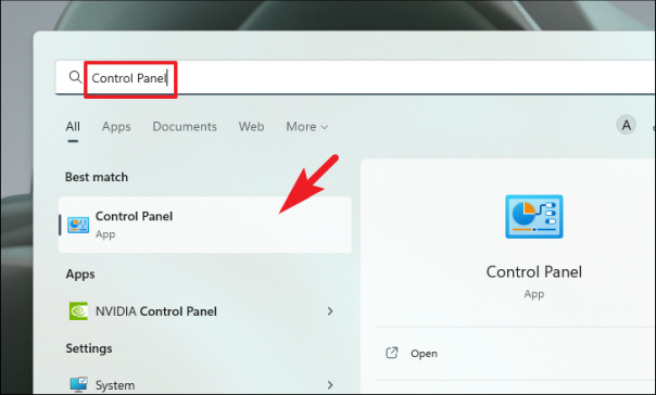Чтобы таким образом удалить параметр гибернации с вашего компьютера, сначала перейдите в меню «Пуск» и введите «Меню управления». Затем в результатах поиска щелкните плитку «Панель управления», чтобы продолжить.
