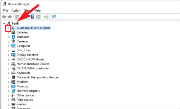 Затем в окне диспетчера устройств найдите метку «Аудиовходы и выходы» и щелкните маленький шеврон (стрелка вниз) перед ним, чтобы развернуть раздел.