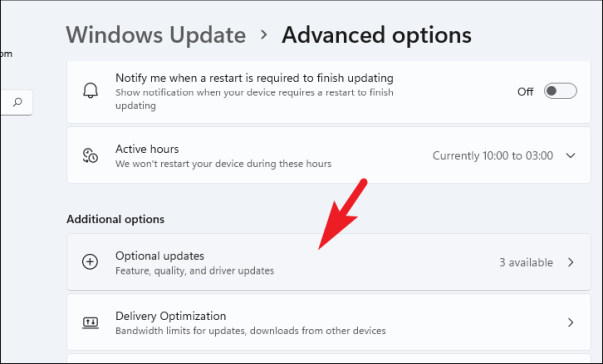 Затем найдите раздел «Дополнительные параметры» и щелкните плитку «Дополнительные обновления» в разделе, чтобы продолжить.