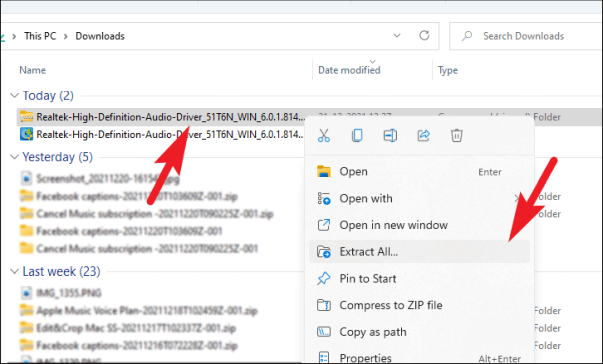 Если загруженный файл представляет собой .ZIP папку, щелкните папку правой кнопкой мыши и выберите в контекстном меню опцию «Извлечь все». После извлечения содержимого найдите .EXE файл и дважды щелкните его, чтобы установить аудиодрайвер.