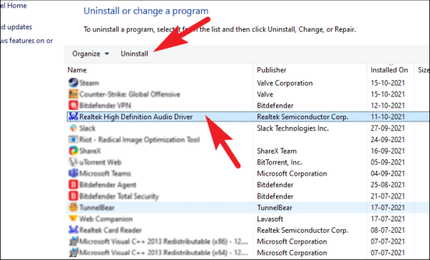После этого найдите свой аудиодрайвер в списке и щелкните его, чтобы выбрать. Затем нажмите кнопку «Удалить» на верхней ленте, чтобы удалить драйвер из вашей системы.