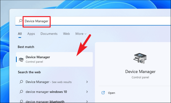 Сначала откройте меню «Пуск» и введите «Диспетчер устройств», чтобы найти его. Затем в результатах поиска щелкните плитку «Диспетчер устройств», чтобы открыть ее.