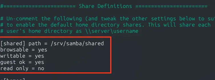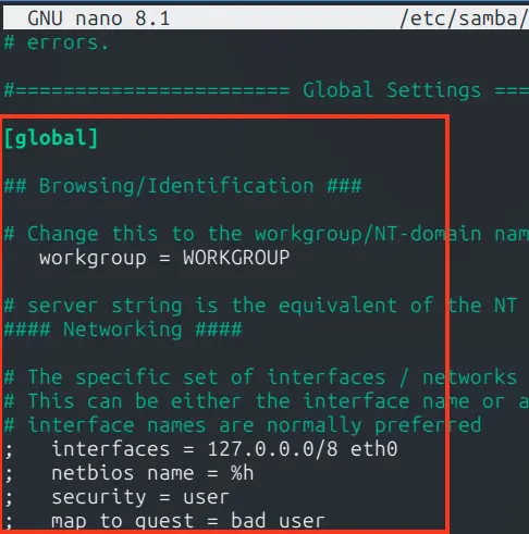 Основная конфигурация Samba хранится в файле /etc/samba/smb.conf. Откройте его для редактирования: