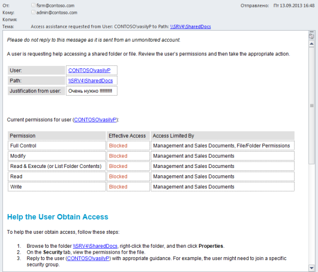 Вот так выглядит сообщение, полученное администратором сервера. В нем содержится вся необходимая информация: путь к ресурсу, имя пользователя и его текущие разрешения, утверждения для пользователя и устройства и описание проблемы самим пользователем. Все это поможет оперативно принять решение о предоставлении доступа.