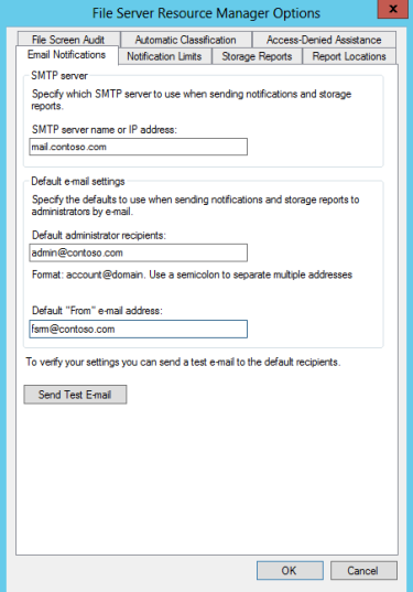 Set-FSRMSetting -SMTPServer ″mail.contoso.com″ -AdminEmailAddress ″admin@contoso.com″ -FromEmailAddress ″fsrm@contoso.com″