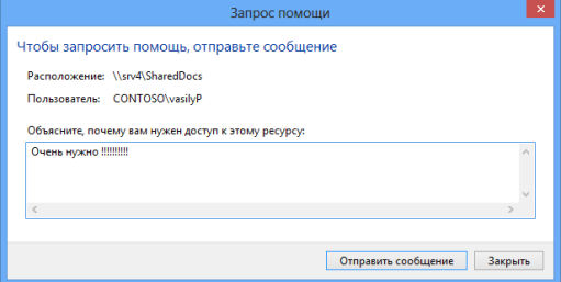 Access Denied Assistance как раз предназначен для разрешения подобных проблем. Он активируется на файловом сервере, и когда пользователь пытается получить доступ к ресурсу, ему будет показано специальное диалоговое окно, в котором можно запросить разрешение на доступ. Microsoft описывает несколько вариантов решения проблемы с доступом: