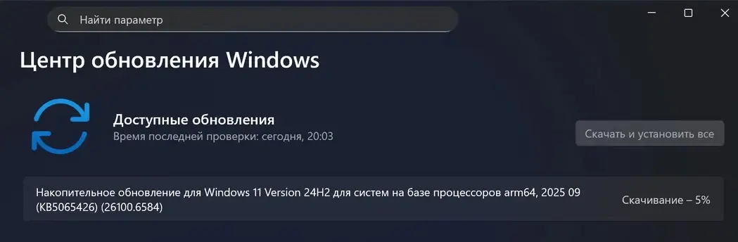 1. Обновите систему через «Параметры → Обновление и безопасность → Центр обновлений», чтобы получить KB5065426.