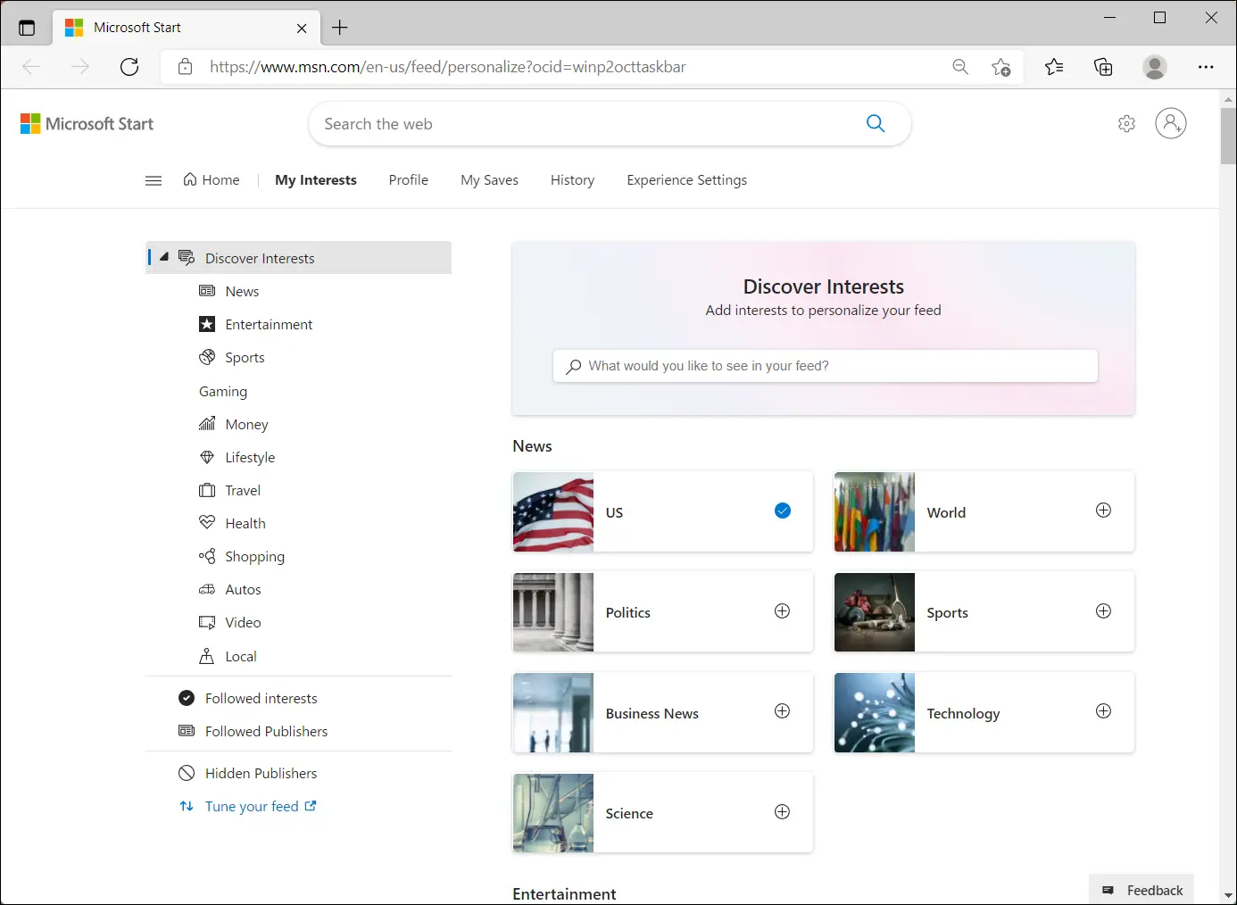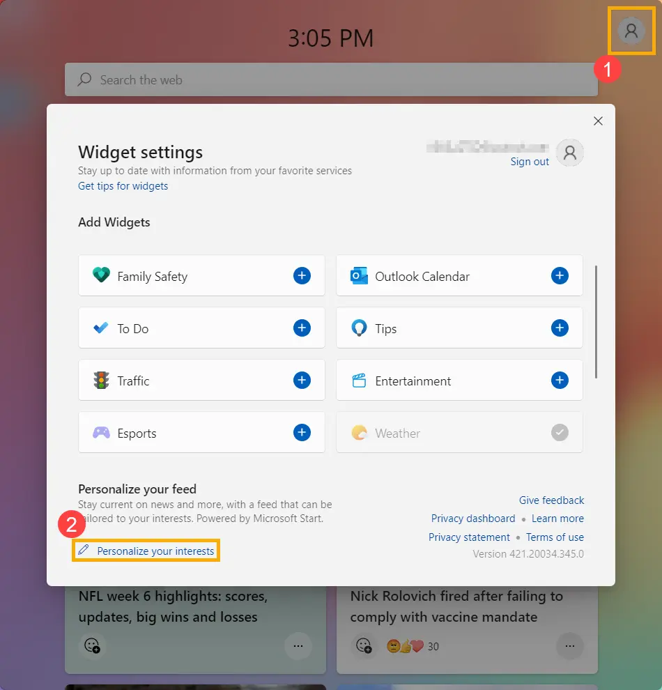 5. В настройках персонализации Widgets найдите раздел «Personalize your interests» и включите или подберите темы историй и новостей, курируемых Copilot.