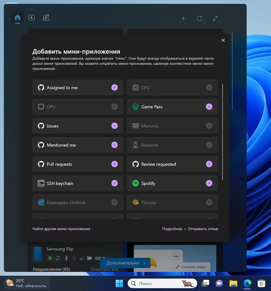 2. Откройте Widgets (клик по иконке Widgets на панели задач или через меню).