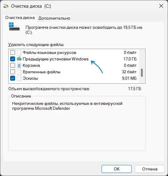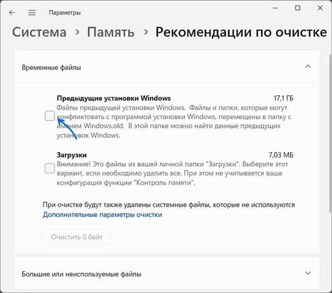 4. Поставьте галочку на «Предыдущие установки Windows» и «Временные файлы установки».