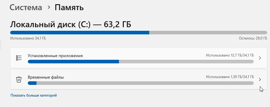 Включите контроль памяти. В «Параметры → Система → Хранилище» включите функцию «Контроль памяти» — Windows сама будет удалять временные файлы и старые обновления.