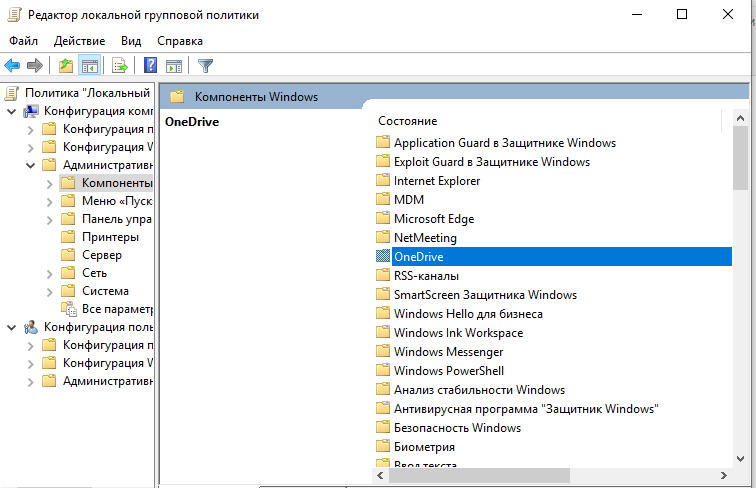 - После открытия редактора локальной групповой политики на левой панели откройте «Политику локального компьютера» > «Конфигурация компьютера» > «Административные шаблоны» > «Компоненты Windows» > «OneDrive».