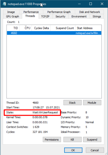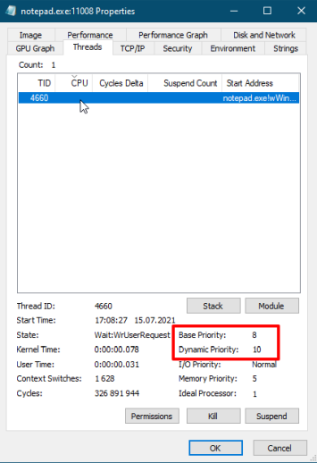Получается что относительный приоритет у потока Notepad.exe равен 2, так как динамический приоритет больше базового на 2.