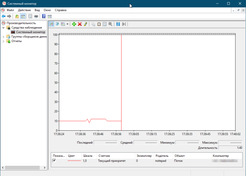 7. Как только вы щелкните мышкой по блокноту, то заметите в Системном мониторе, что приоритет у потока «Блокнот» поднялся до 12, если свернуть блокнот то приоритет вновь упадет до 10.