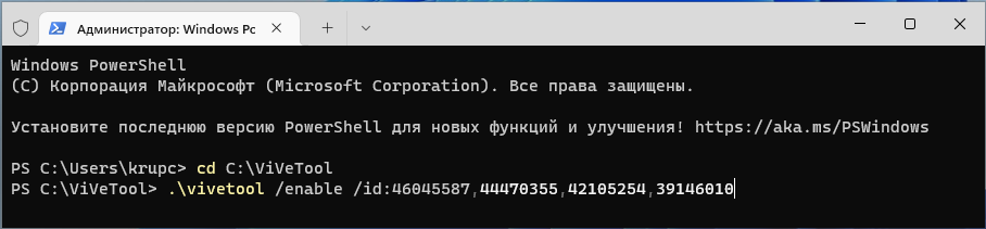 .vivetool /enable /id:46045587,44470355,42105254,39146010
