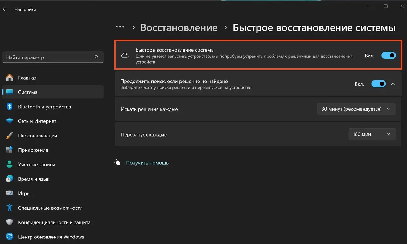 – Перейдите в Параметры → Система → Восстановление (Recovery) → Quick machine recovery. Там можно включить функцию.