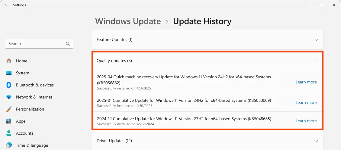 – После успешного применения исправления, вы увидите запись в Параметры → Обновление и безопасность → История обновлений → раздел «Качество (Quality updates)».