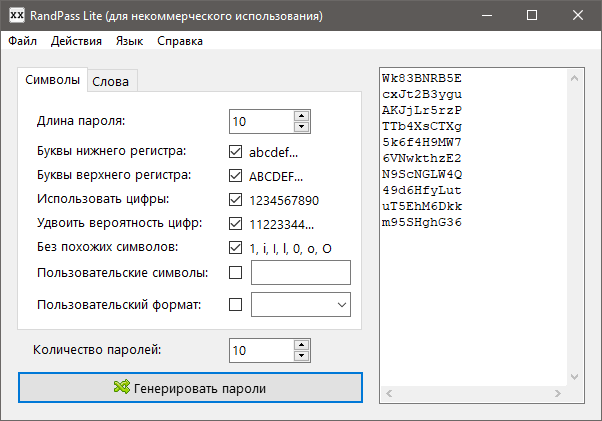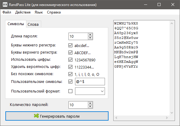 За один раз приложение может сгенерировать до одной тысячи паролей, состоящих из букв верхнего и нижнего регистров, цифр и специальных символов. Последние в RandPass называются пользовательскими и по умолчанию отключены. Чтобы включить их в состав пароля, нужно отметить галочкой одноименный чекбокс в окне программы и ввести в него нужно количество знаков. Кстати, вы можете использовать в паролях кириллицу или любые другие печатные и скрытые символы.