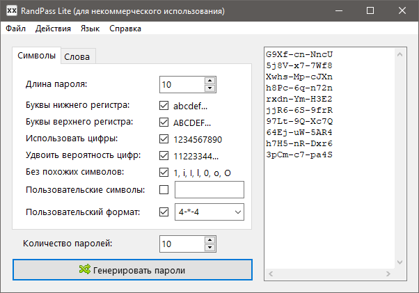 Нажатие кнопки «Генерировать пароли» автоматически создаст пароли и выведет их список в расположенном в правой части окна приложения поле. При необходимости созданные пароли можно сохранить в текстовый файл через главное меню «Файл». Из особенностей генератора паролей можно отметить опцию «Пользовательский формат», позволяющий разделять «основные» символы звездочками и дефисами. По умолчанию эта опция тоже отключена.