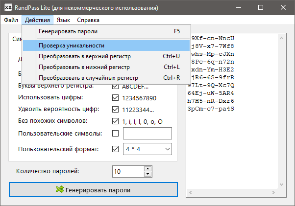 Хороший пароль должен содержать как минимум 6-8 символов, причем не только буквы разного регистра, но также цифры и специальные символы. Ничто не мешает создавать пароли вручную, но если таких комбинаций нужно создать несколько десятков, удобнее использовать для этого генераторы типа RandPass. Эта бесплатная программа как раз предназначена для создания стойких паролей с использованием заданных параметров.