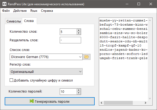 Сами словари представлены обычными текстовыми файлами, содержащими списки в несколько тысяч слов, в том числе на русском языке. Создавать словари вы можете и сами в Блокноте, заменяя стандартное расширение TXT на WORDLIST. Как и в случае с паролями из символов, функцией создания паролей из слов поддерживается выбор регистра и добавление случайных символов.