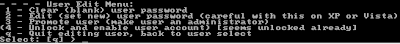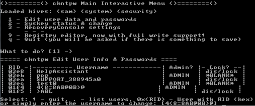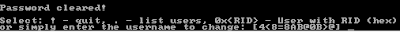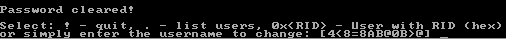 Далее мы видим список аккаунтов. Вам нужно ввести вручную имя того, у которого собираетесь снести пароль. Если имя пользователя содержит в себе русские буквы, можно ввести всесто имени содержимое поля RID. Кириллица не поддерживается, к сожалению.