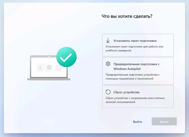Если в процессе установки операционной системы вам нужно запустить процедуру предварительной подготовки с использованием Windows Autopilot, сбросить компьютер к «заводским» настройкам или установить пакет подготовки системы (файл ppkg), нажмите пять раз подряд клавишу Win.