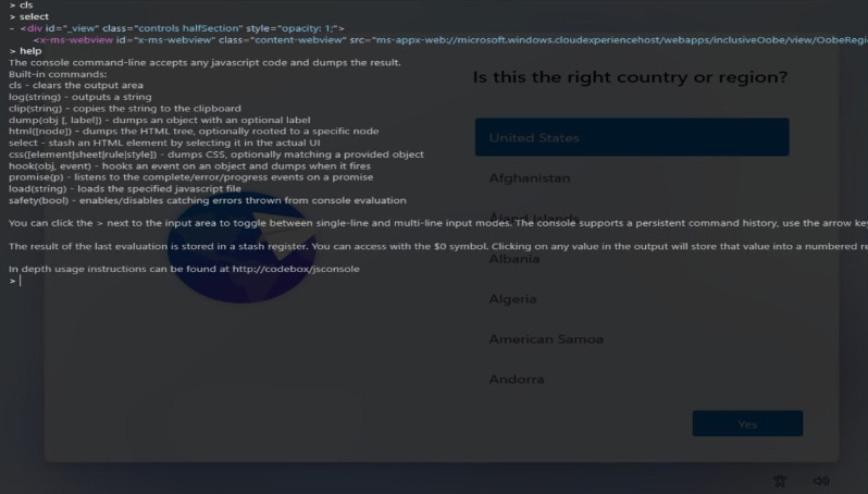 Наконец, если нажать комбинацию Ctrl + Shift + J, прямо поверх экрана OOBE откроется полупрозрачная консоль разработчика. Она поддерживает выполнения некоторых команд управления экраном OOBE, например, включение и отключение журналирования событий экрана подготовки, переход от одного окна OOBE вперед и назад. Кроме того, консоль разработчика поддерживает выполнение встроенных команд JavaScript.